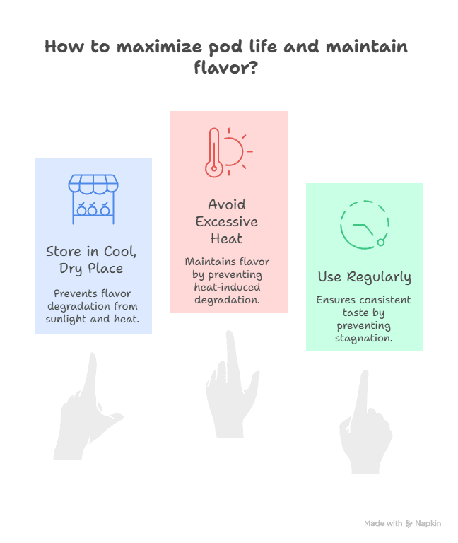 Store pods in a cool dry place away from direct sunlight. Avoid excessive heat to maintain flavor and pod longevity.